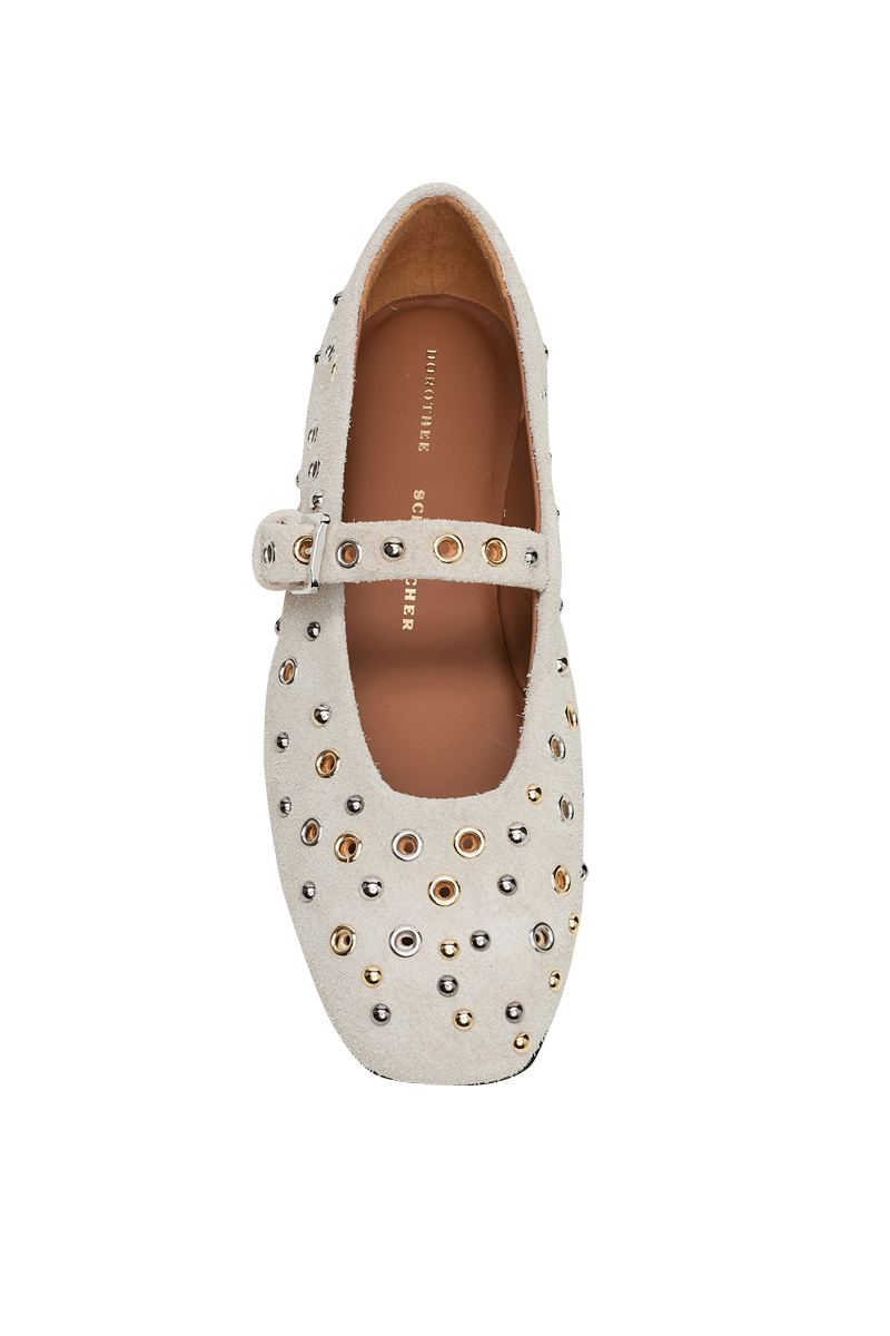 Balleraina aus weichem Kalbverlourleder von DOROTHEE SCHUMACHER mit Ösen und Nietenapplikationen.