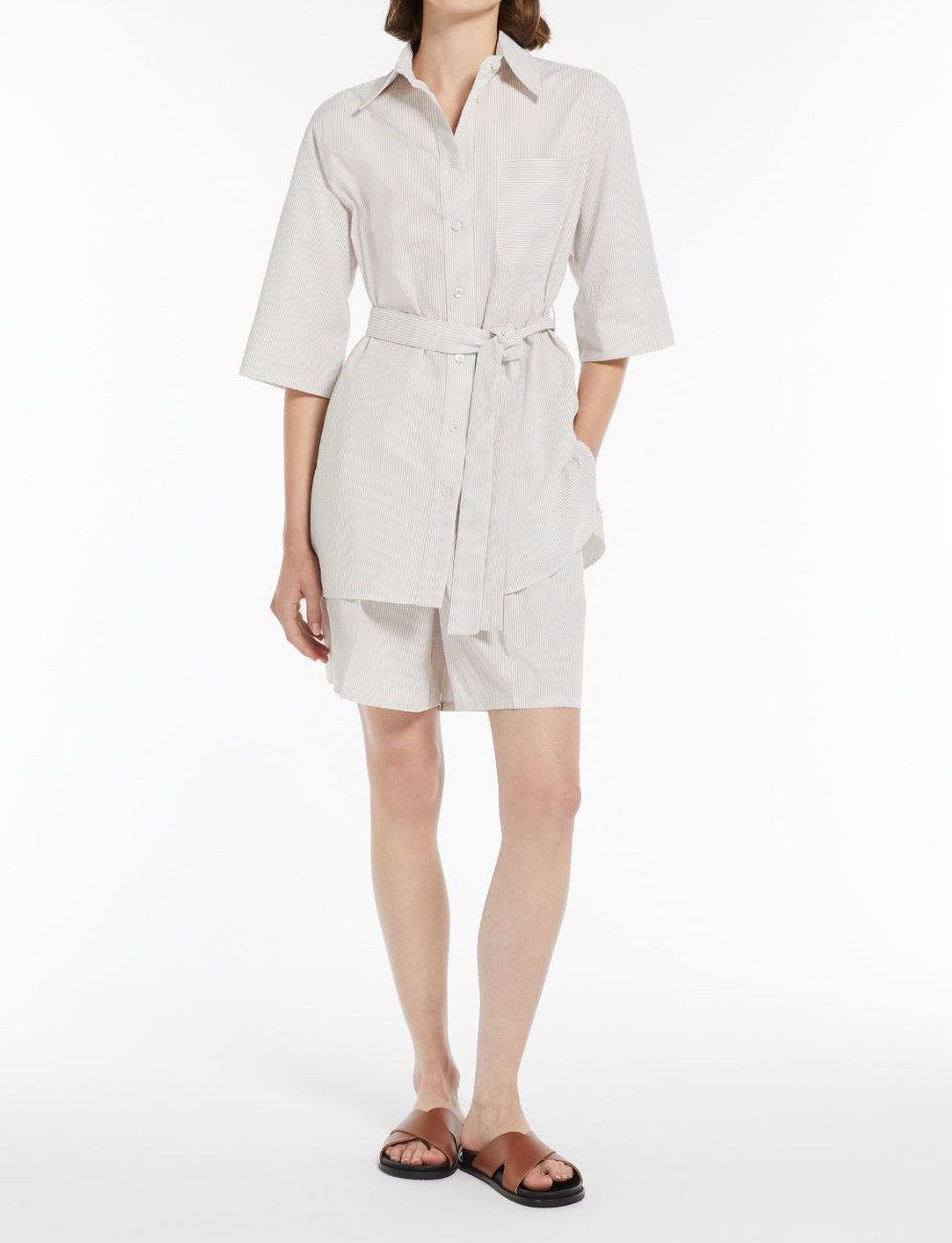 Hemdtunika von MAX MARA aus Seersucker mit klassichem Hemdkragen und kurzen Ärmeln. Klassicher Hemdkragen Kurze Ärmel Gerade Silhouette Zwei Seitenfalten Passender Gürtel Knopfleiste Seitliche Schlitze DEUTSCHE GRÖßENANGABE Modelname: Texas Farbe: ecr Material: 100 % Baumwolle