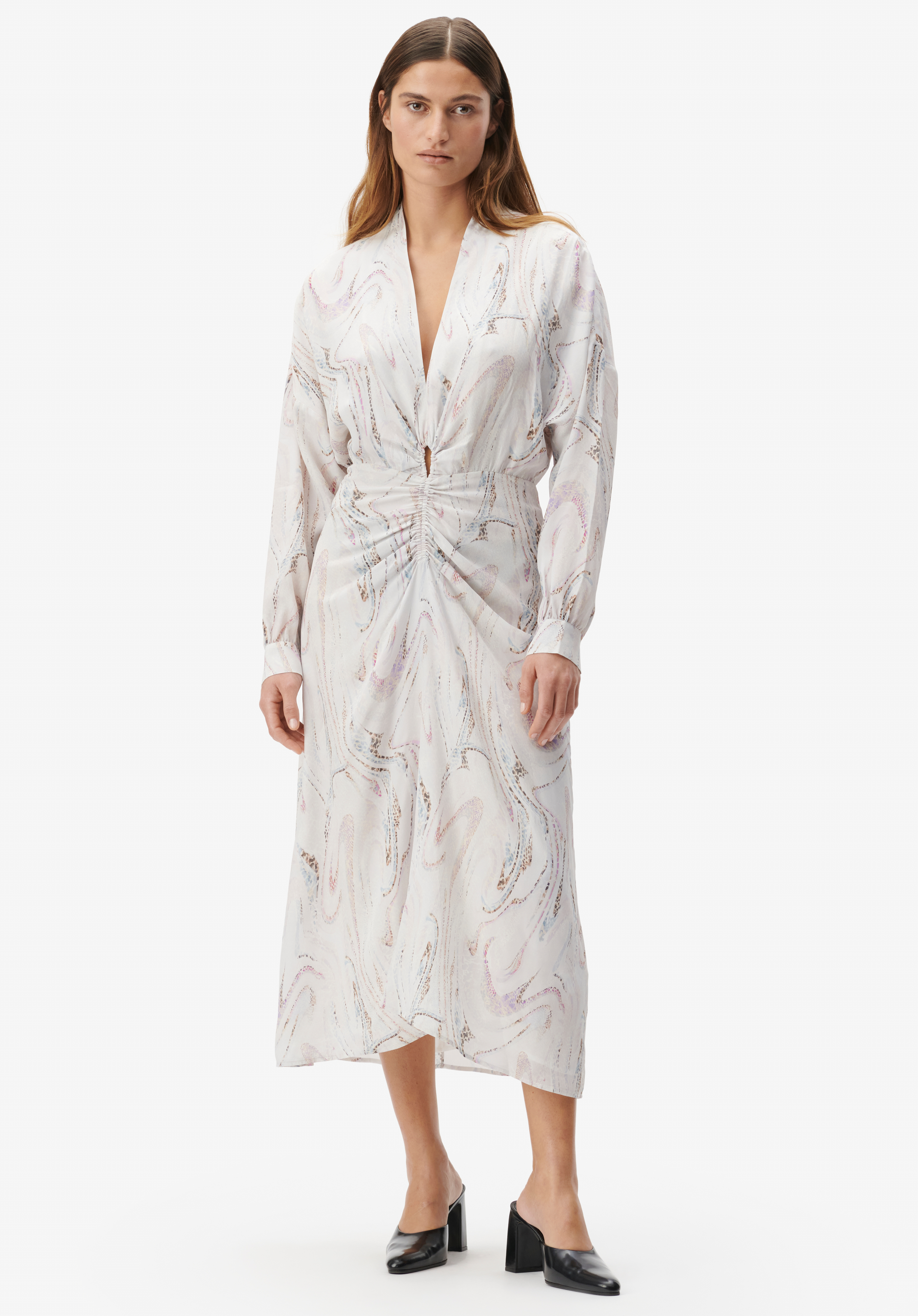 Die moderne Version des Hemdkleides von LALA BERLIN aus einem fließendem Crépe de Chine Stoff mit achatblauem Druck.
