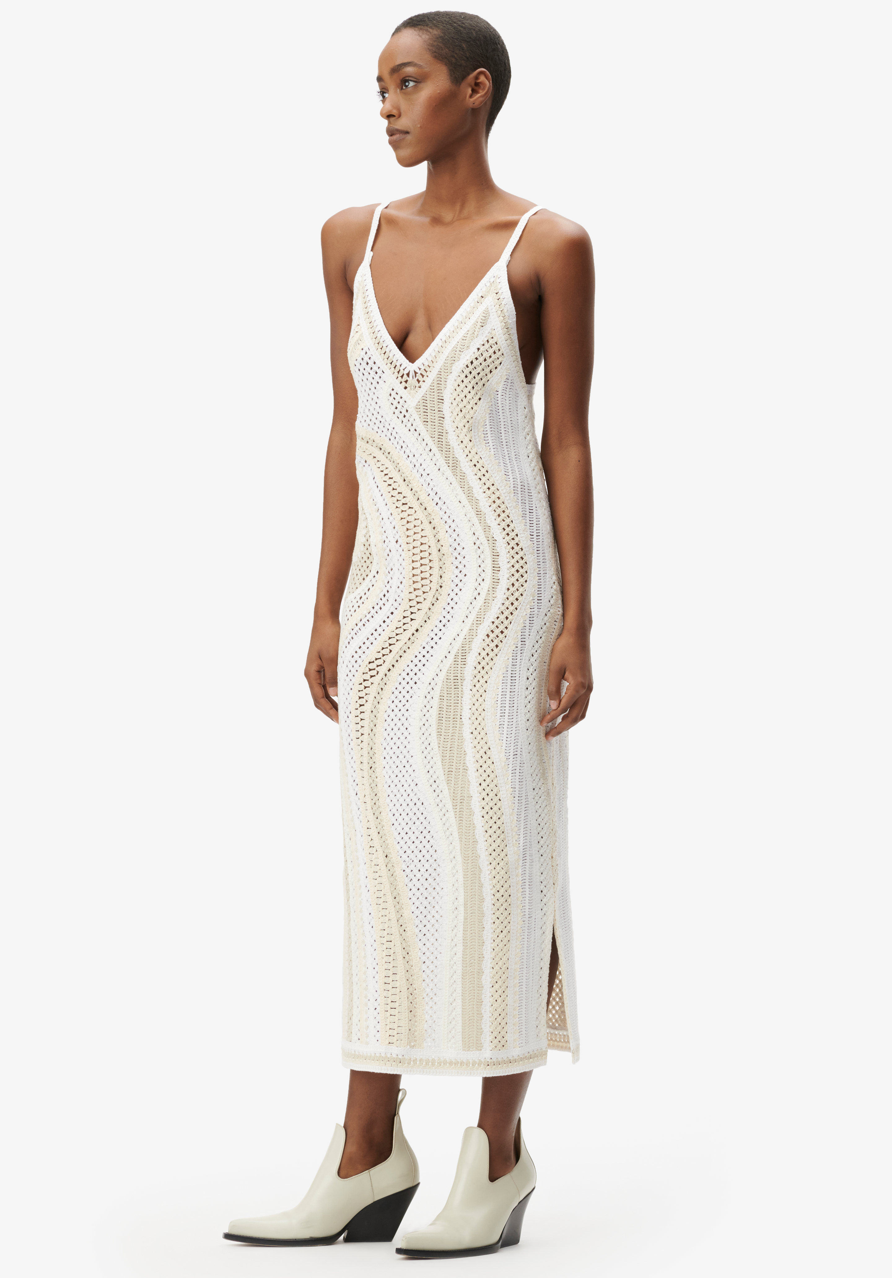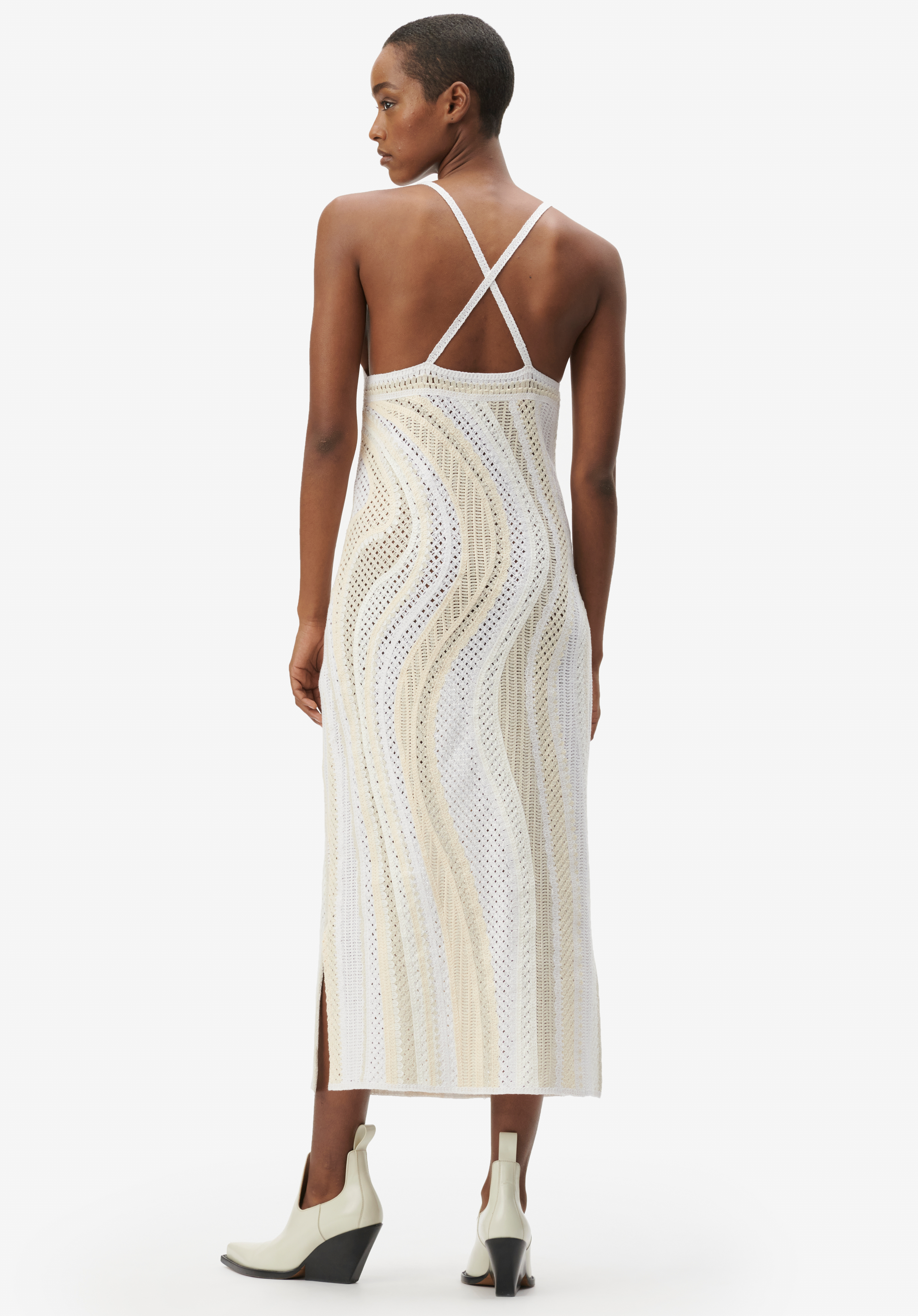 Schmales Häkel-Kleid von LALA BERLIN mit einer wirbelnden Stickereien mit Spaghetti-Trägern.