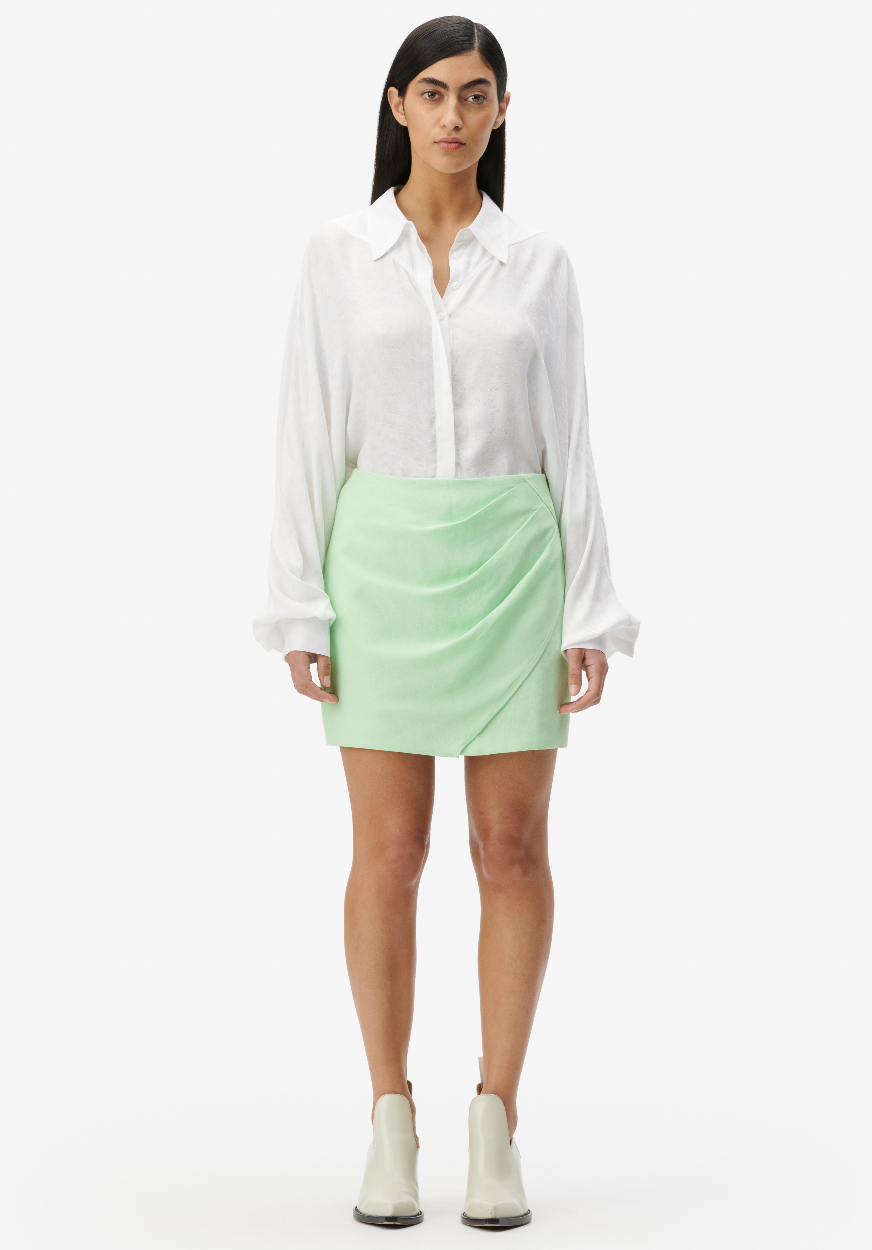 Avocadogrüner Minirock von LALA BERLIN mit asymetrischer Drapierung aus einem leichten Material.